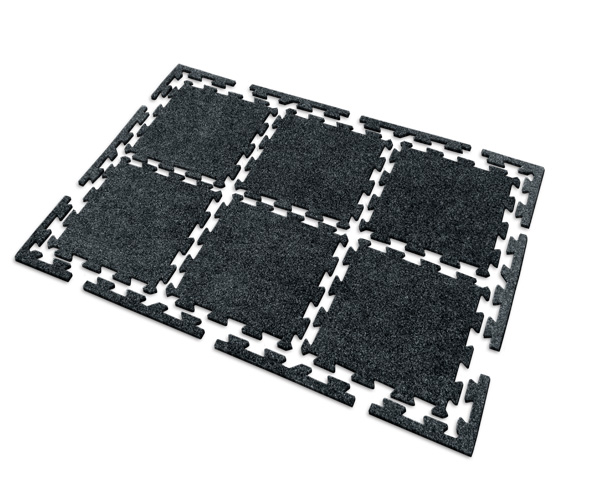Combines the durability of a rubber floor with a decorative carpet surface.